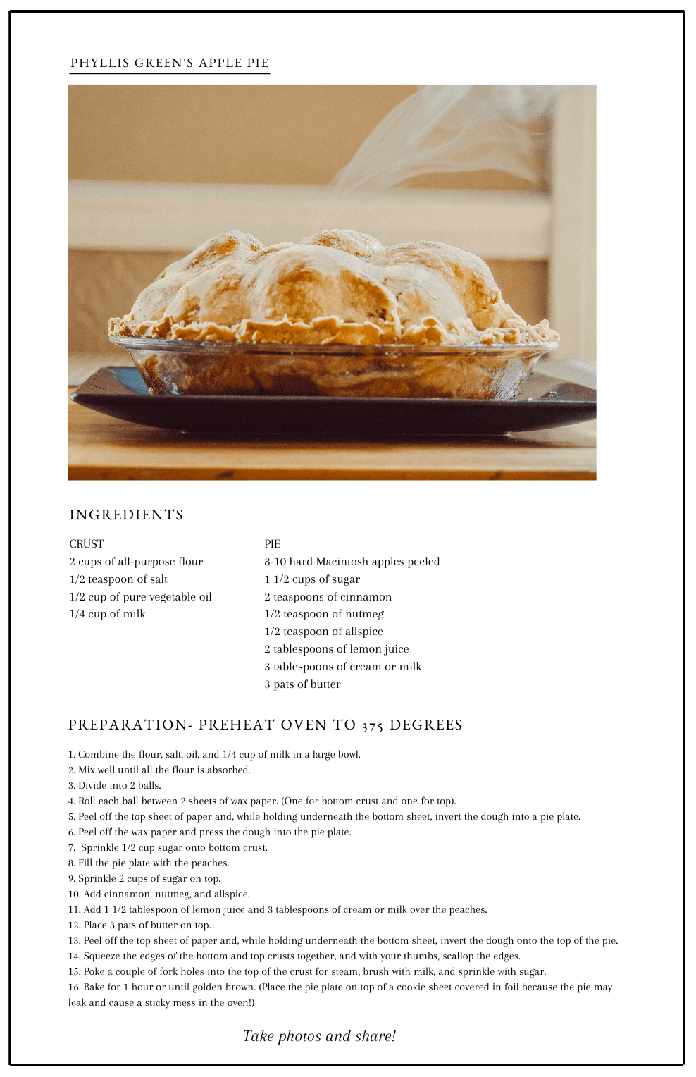 My daughter and I made this fun video of the pie making yesterday. Watch and enjoy! Recipe below. Please credit Phyllis Green when you serve it, she would appreciate that!