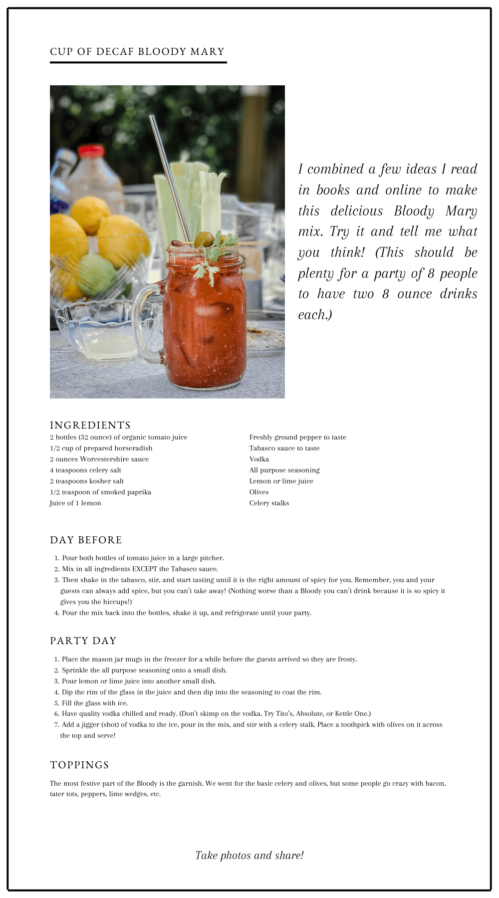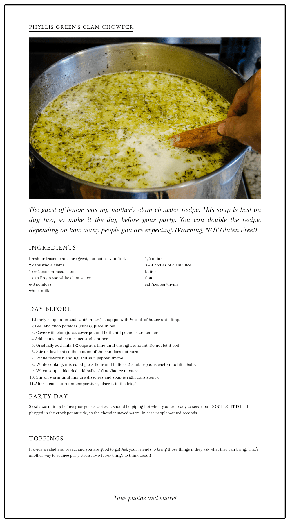 Remember, shop earlier in the week, so you don’t have to stress at the last minute. All of these recipes are GREAT when made the day before serving. You may be busy on the penultimate day, but you will be very relaxed when your guests arrive on party day!